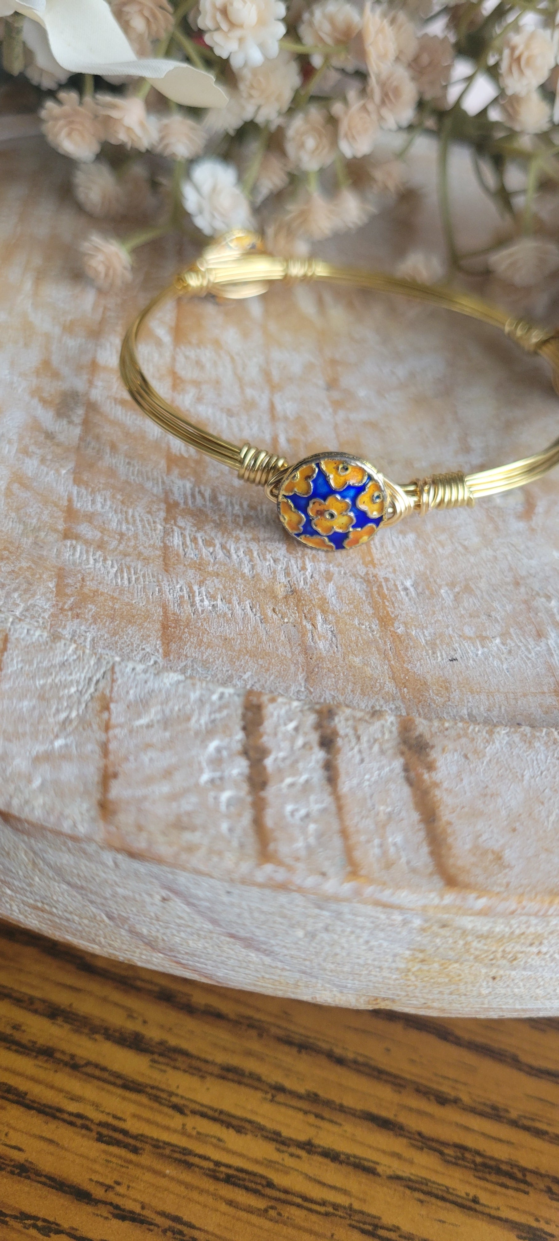 Our blue and orange bangle has handed enamal beads in a blue and orange floral print.