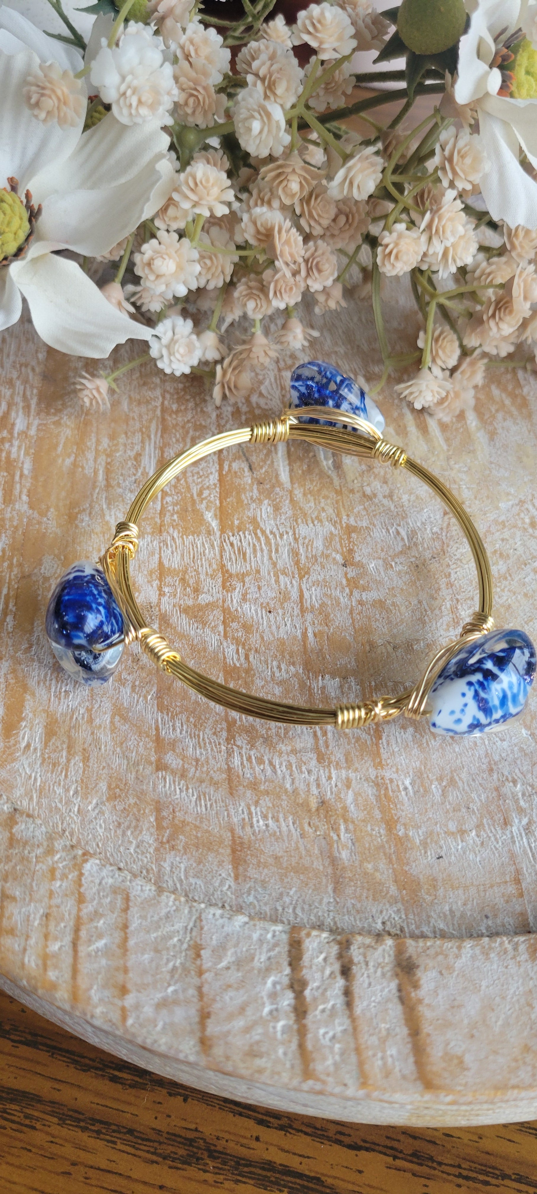Our blue heart bangle has blue and white blown glass heart beads.