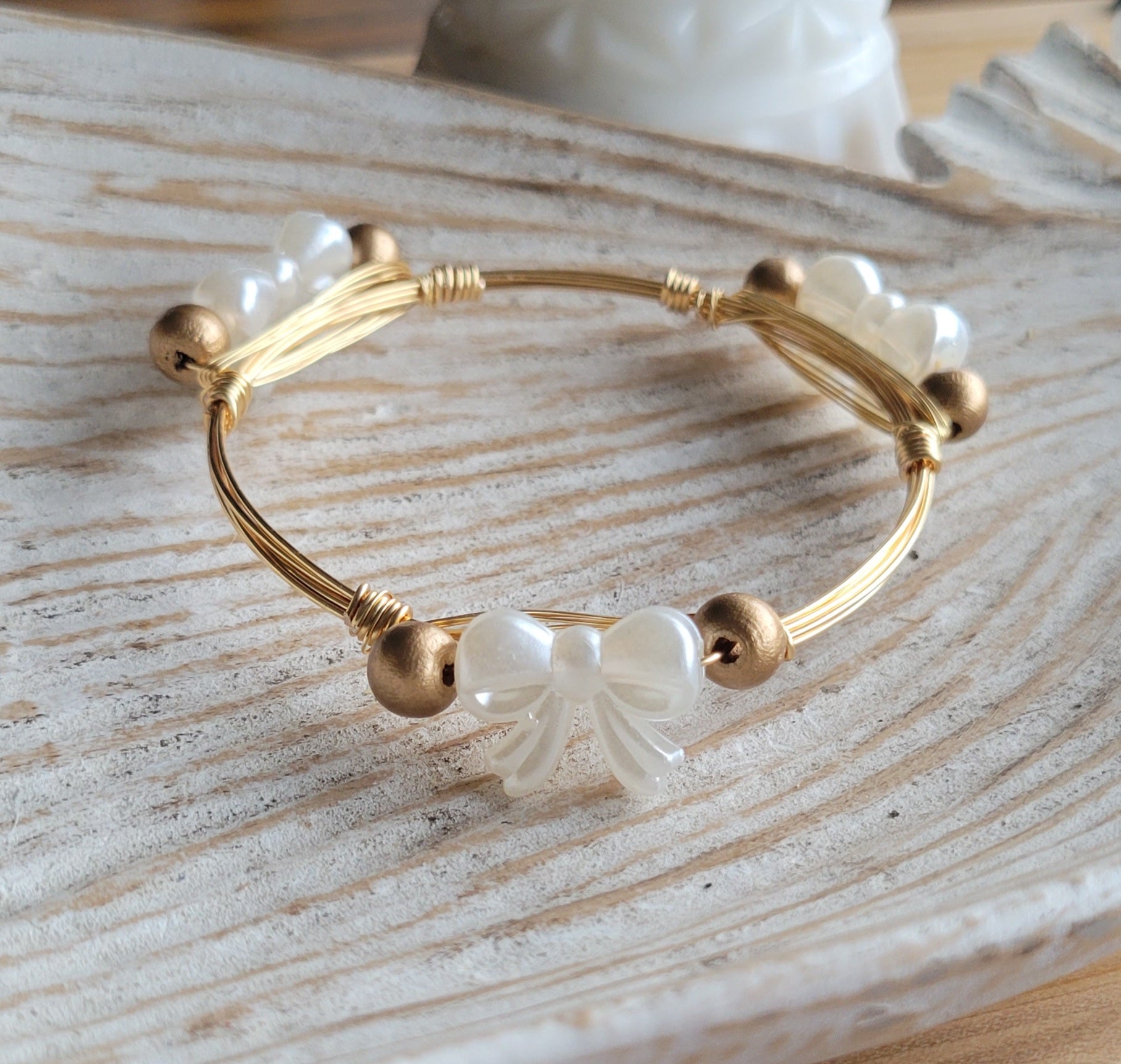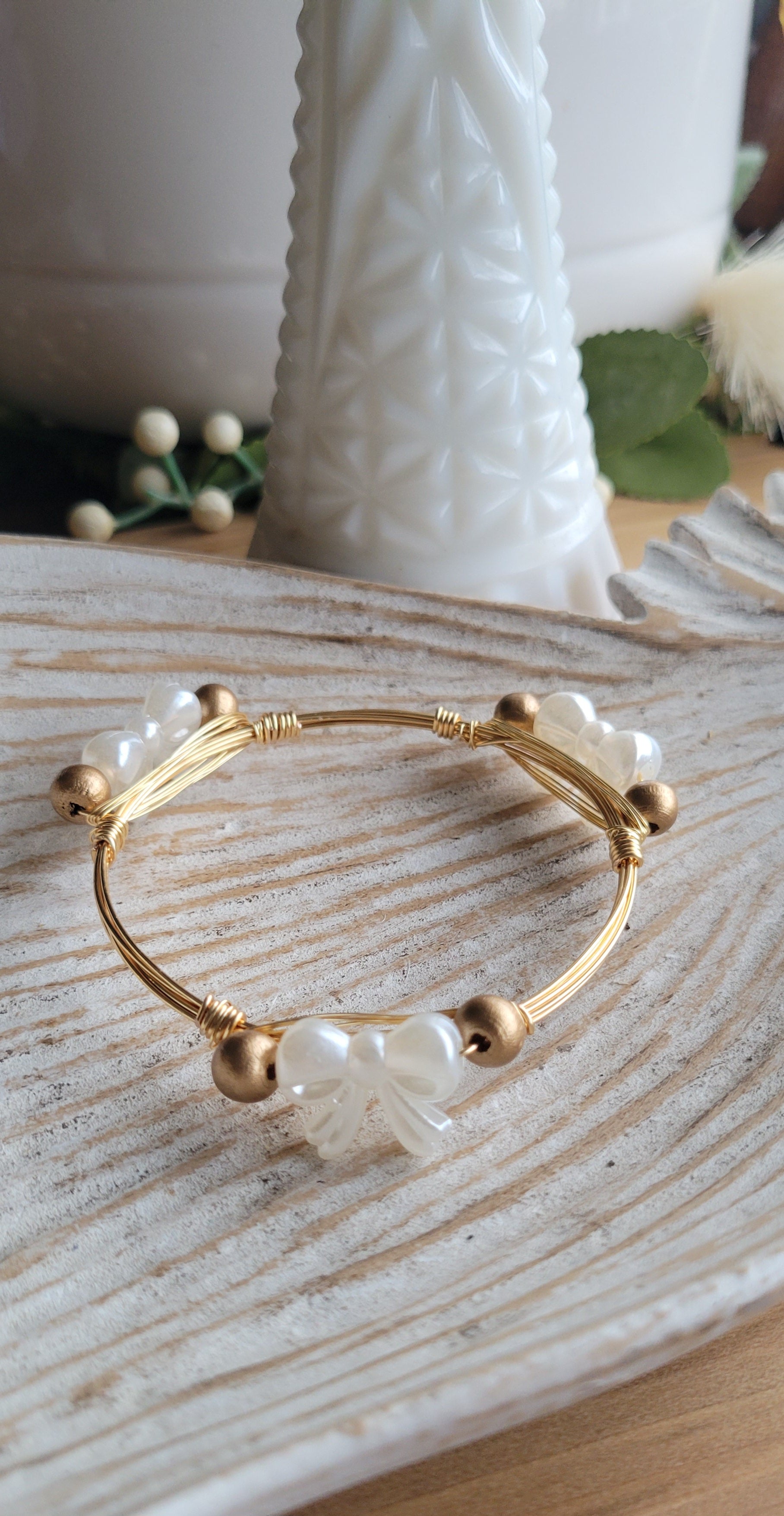 Introducing the newest creation at JEM, Hearts Bangles. They are handcrafted with gold filled tarnish resistant wire. They are pretty enough to wear just one or you can stack them or pair them with other bracelets. Classic blue and white with sweet little bows pair perfectly together to make this beautiful bangle.
