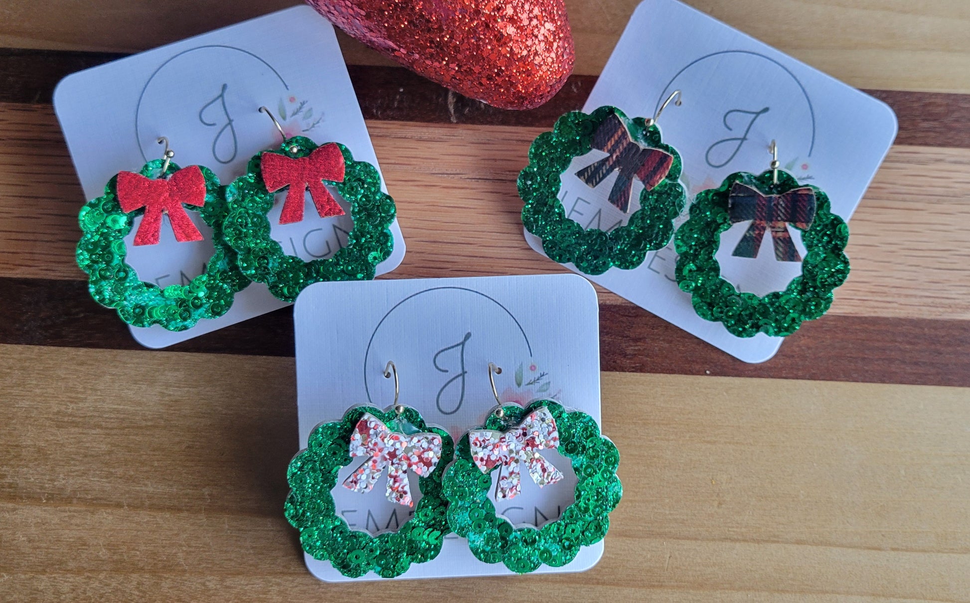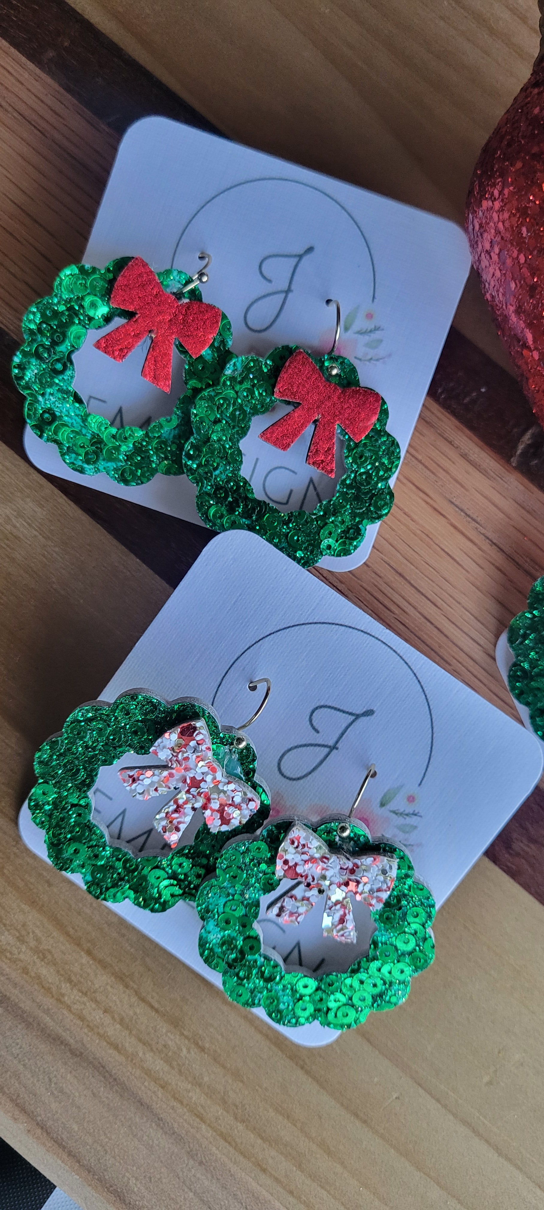 Our beautiful green sequin leather make the prettiest little wreaths. Available in 3 options. These have hypoallergenic stainless steel hooks.