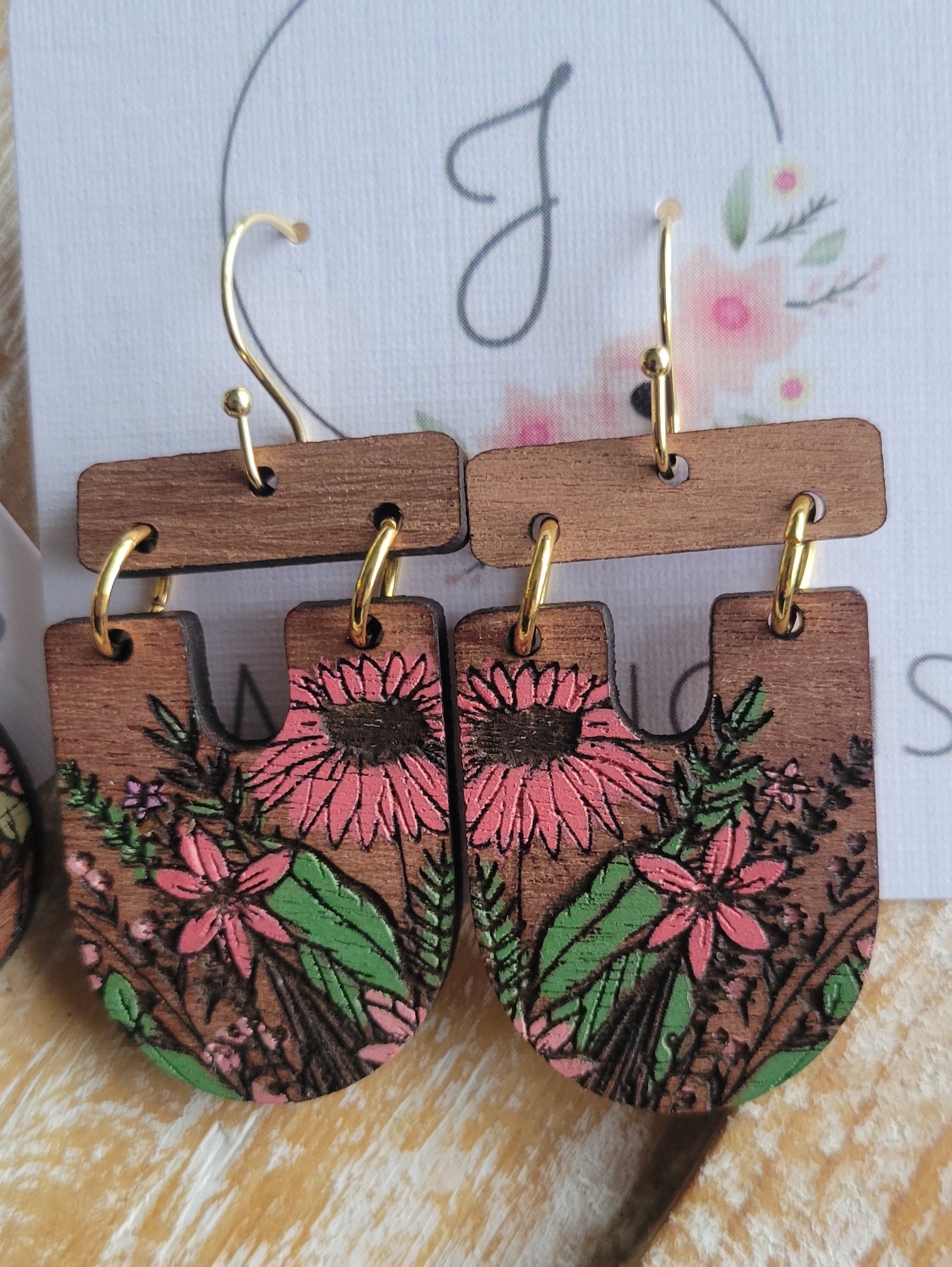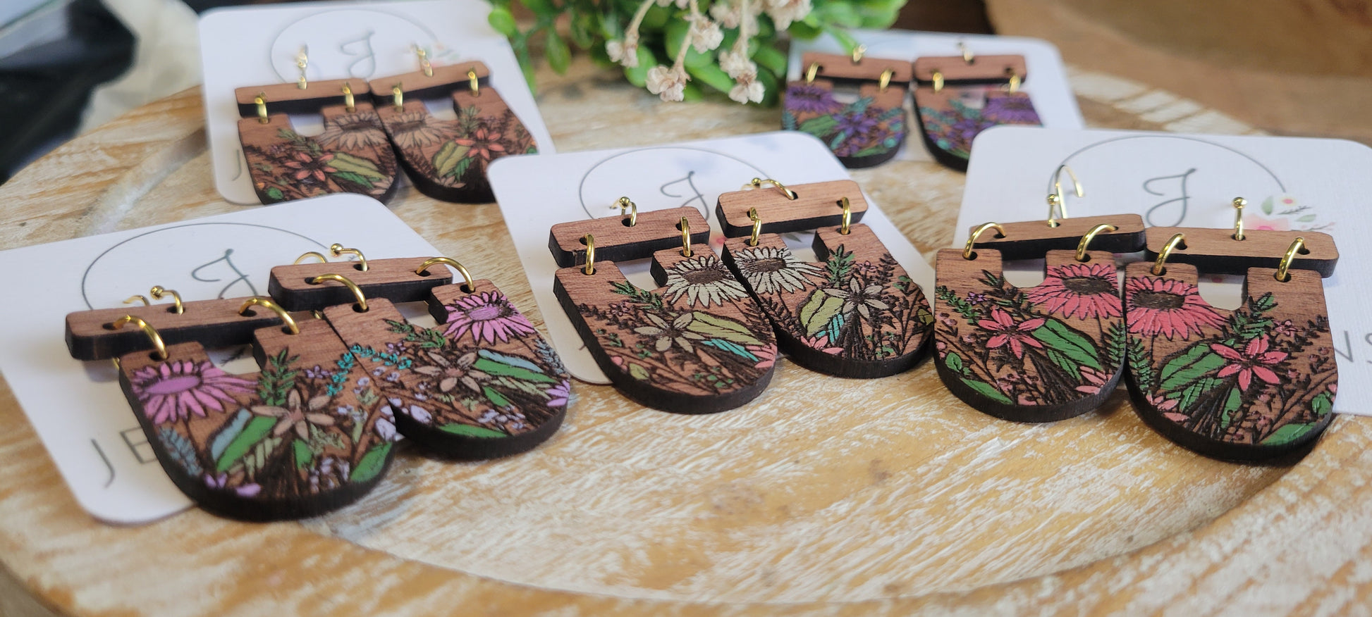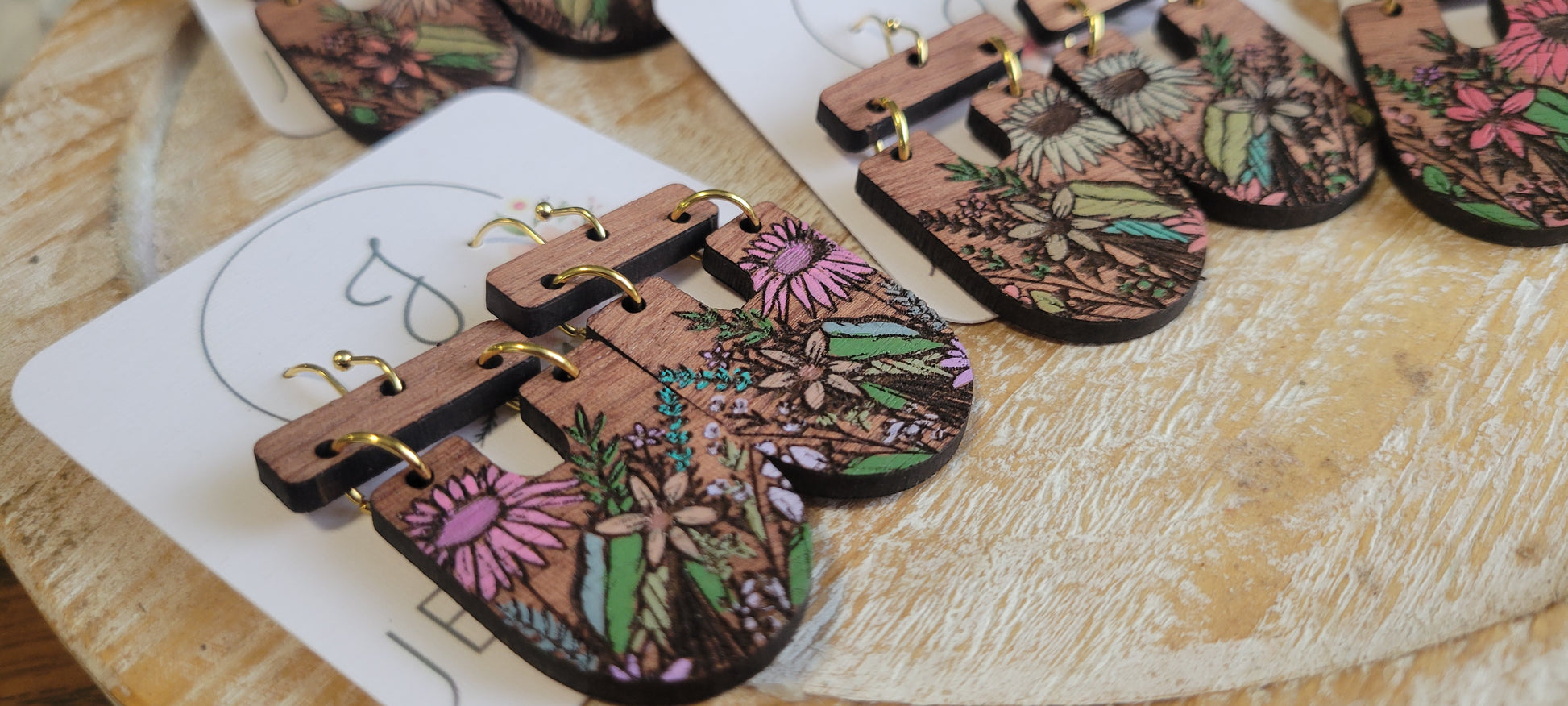Our wood earrings are hand painted. They are lightweight and made with hypoallergenic materials.