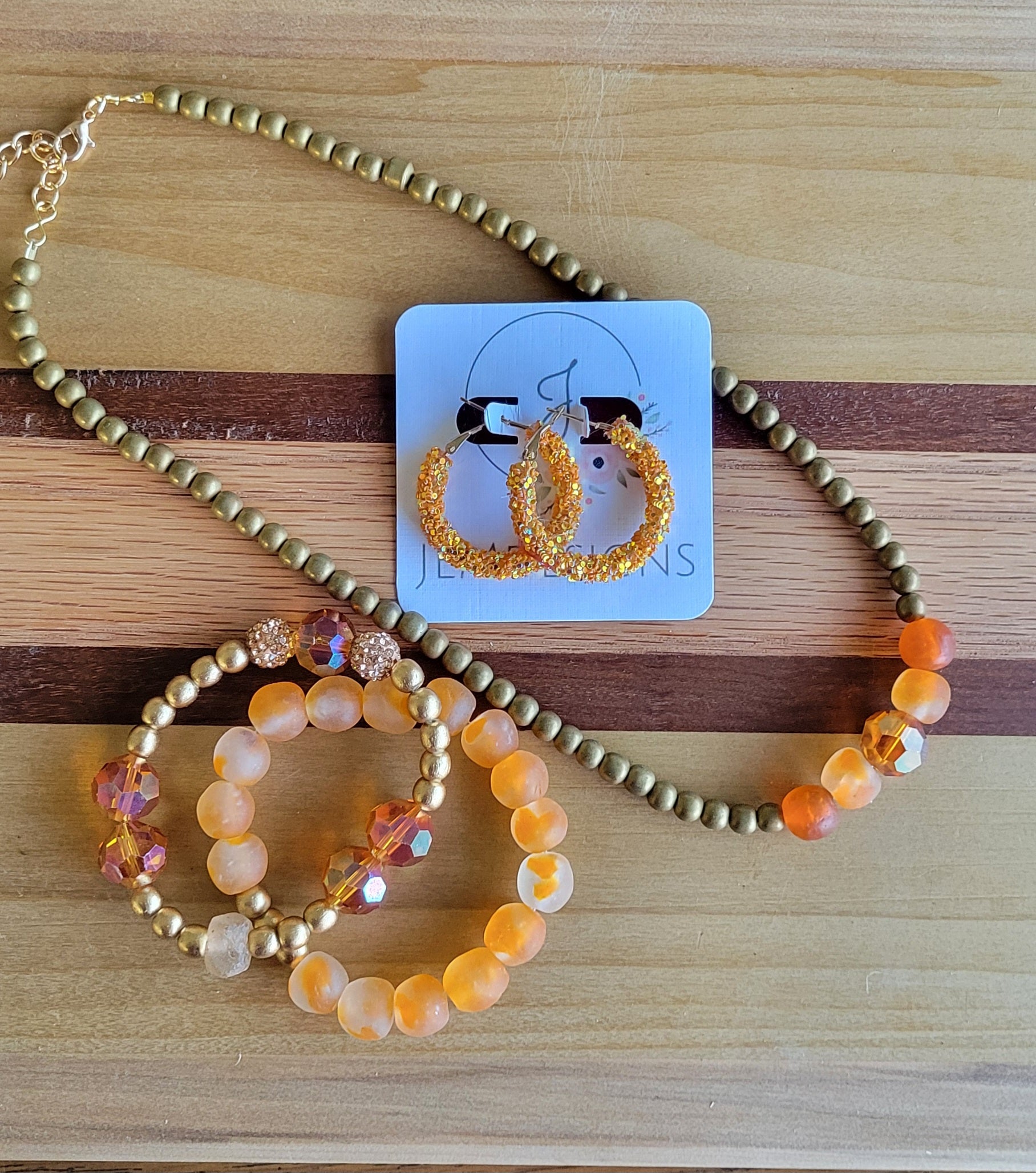 This one of a kind necklace has a variety of unique orange beads and brass accents. It comes with an adjustable chain and clasp.