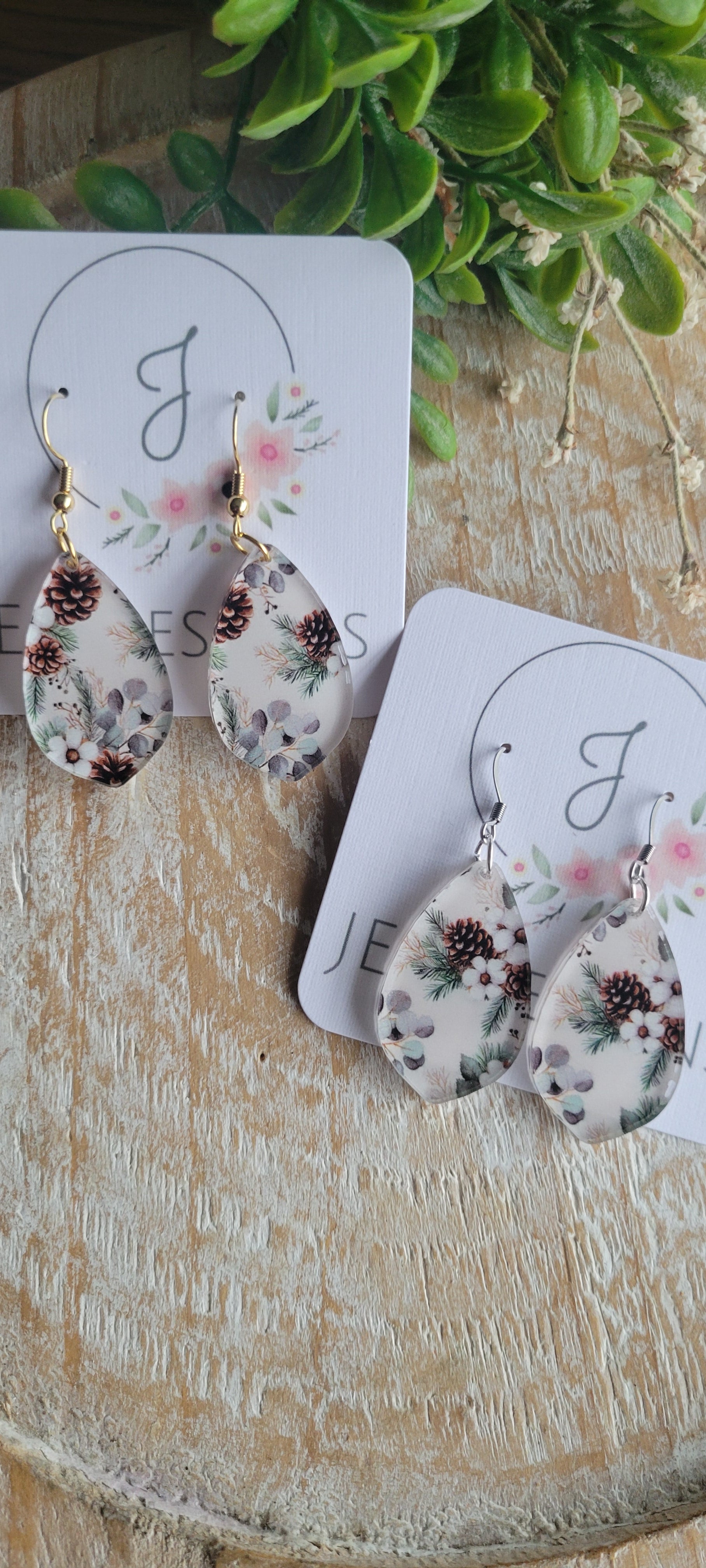 These beautiful winter themed earrings have white flowers, pinecones and eucalyptus leaves with a crisp white background.